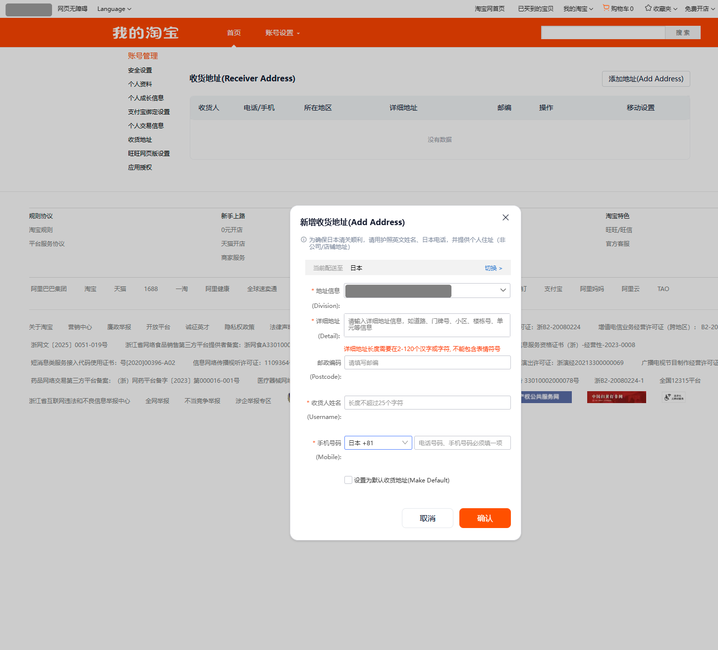 Add Addressから新規に住所追加する。当前配送至から日本を選択地址信息から県市区町村までを選択。選択式で選べます。详细地址に選択以降の住所を記入します。收货人姓名に指名を記入します。手机号码に電話番号を入力します。日本の電話番号であれば、国番号「81」を選択します。