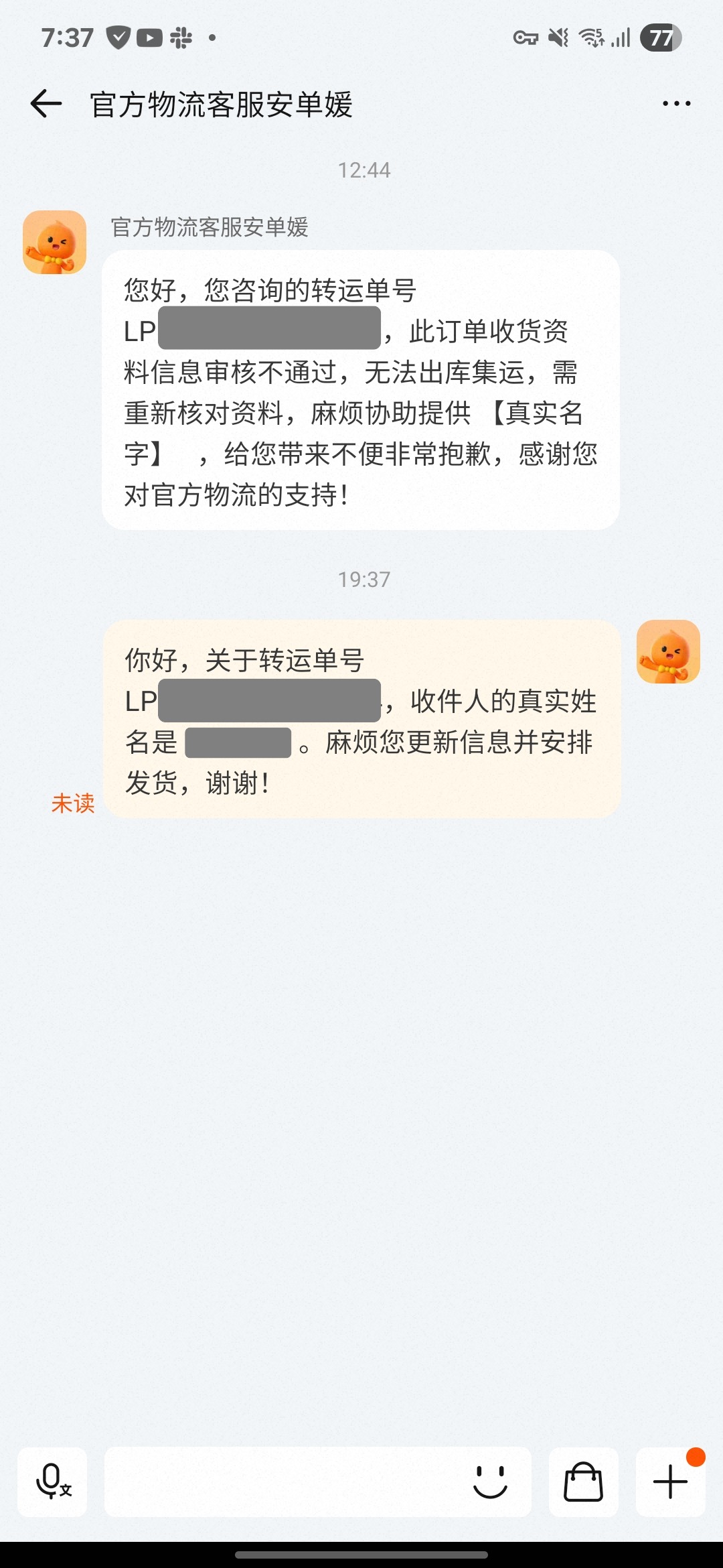 空輸前、物流倉庫から受け取り人の名前が違うとメッセージが来たので、本名を返信しました。